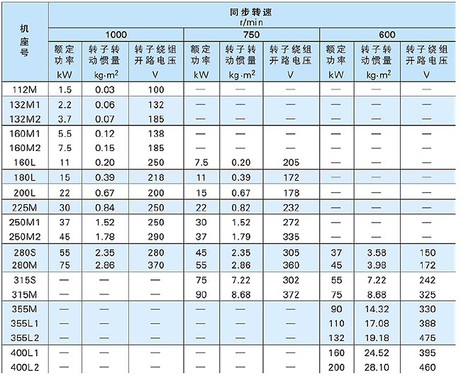 2.2.1 電動機(jī)基準(zhǔn)工作制時(shí)的額定功率、轉(zhuǎn)子轉(zhuǎn)動慣量(J m)、轉(zhuǎn)子繞組的開路電壓(U2)與機(jī)座號的對應(yīng)關(guān)系符合表2的規(guī)定。